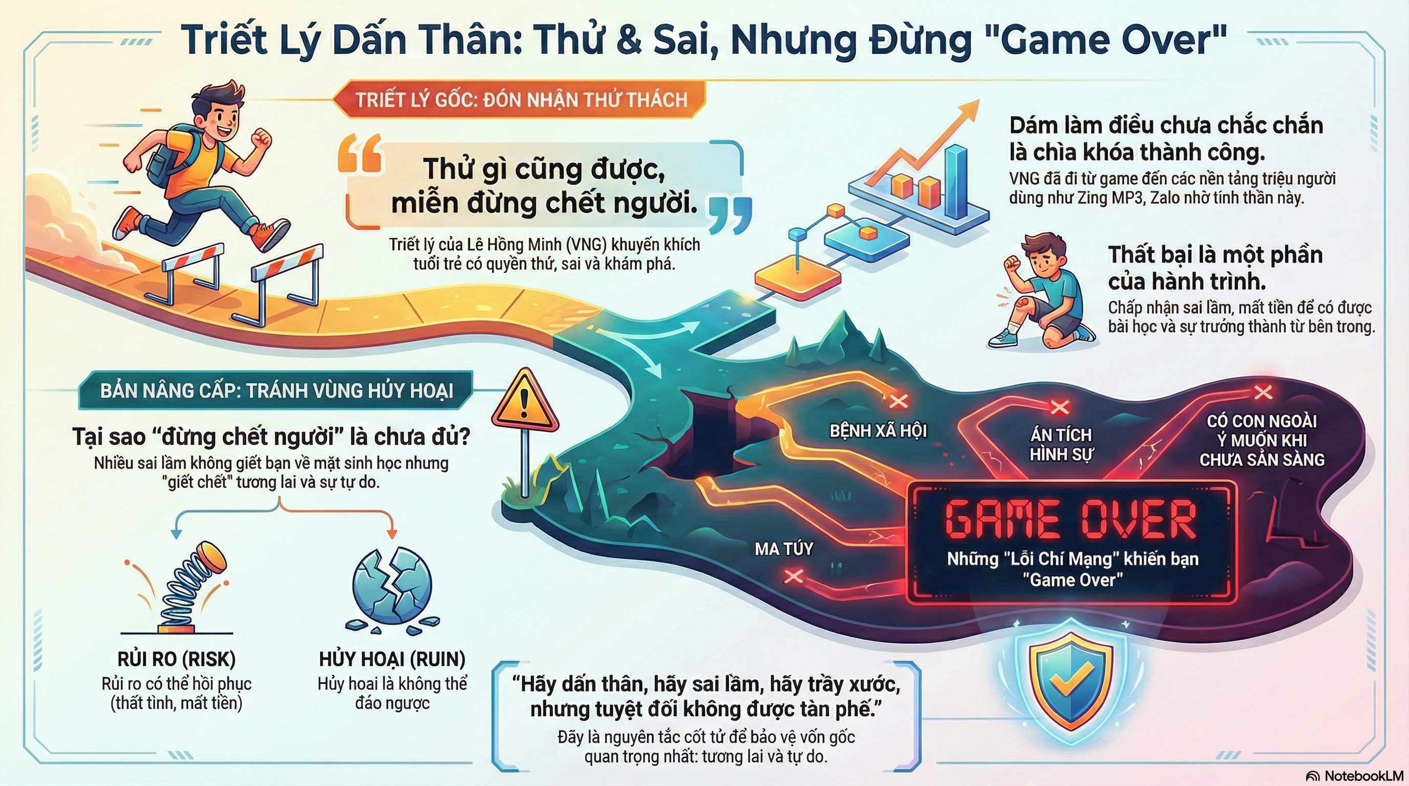 Những tổ chức lớn như VNG cũng trưởng thành từ việc “vừa làm vừa học”, sai đến đâu sửa đến đó. Bài học thực sự chỉ đến khi con dấn thân vào những điều chưa chắc chắn.